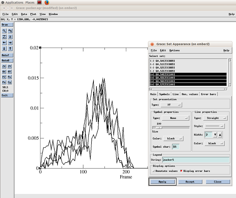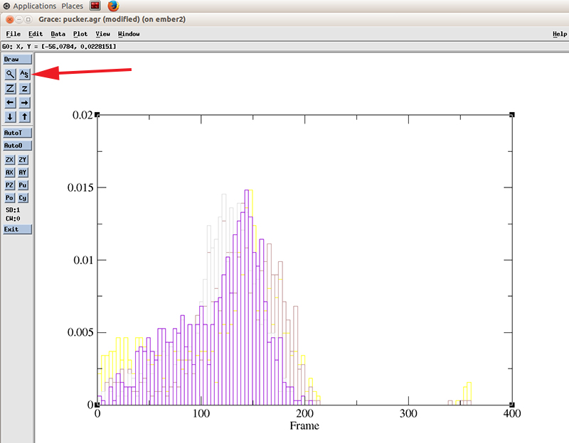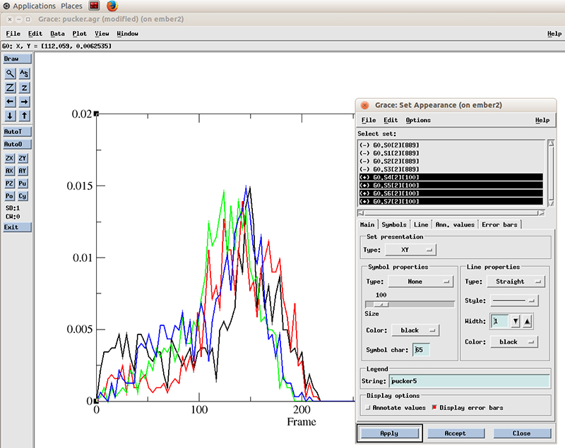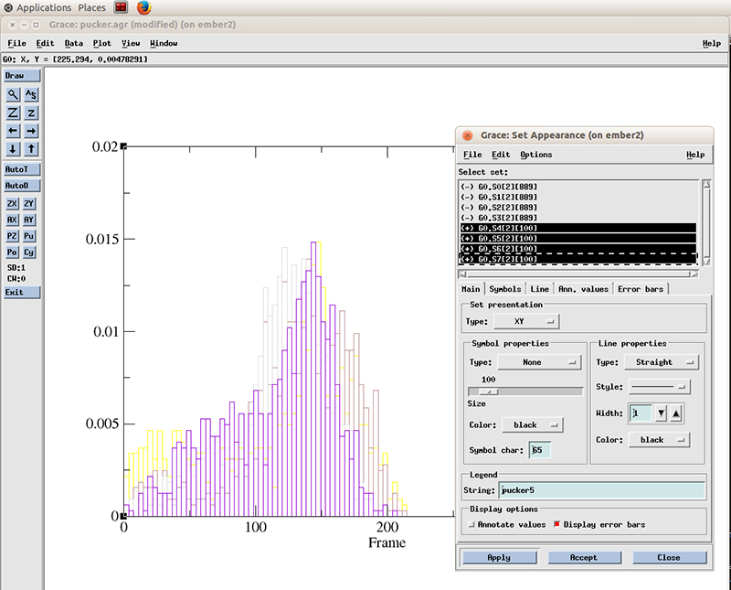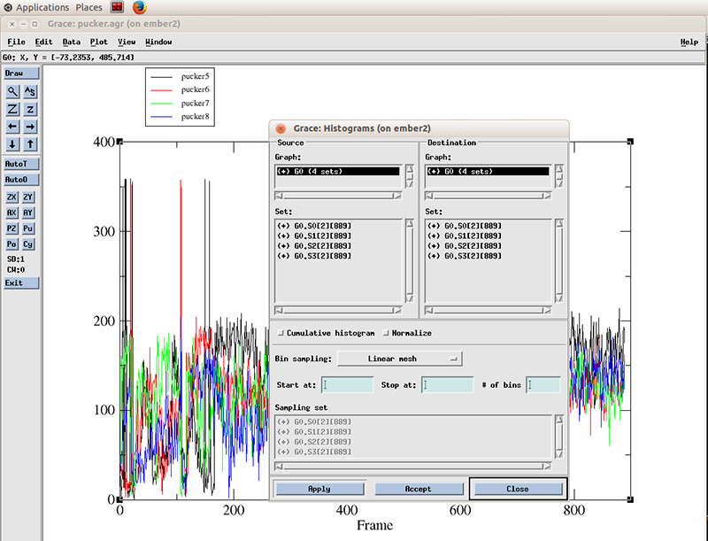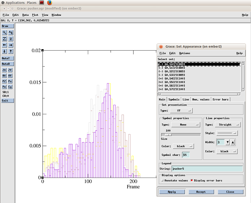 The pucker distribution is easier to differentiate if we calculate the histogram for each residue. In xmgrace, we go to -> Data -> Transformations -> Histograms...