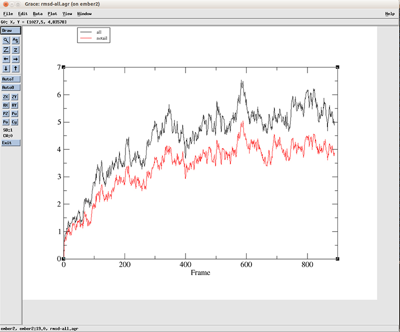 We have two lines, which corresponds to the two datasets we calculated with CPPTRAJ. The blackline is using all the residues and the red line is using residues 3 to 10 and 15 to 22. We can see that a variation of more than 4 angstroms is present at the starting of the simulation for the black line (using all atoms) and a little lower for the red line. After around the frame 400, the values fluctuate between 4.5 and 5.5 angstoms when using all atoms and around 3.5 and 4.5 for the central base pairs. This suggest a big conformational shift early on the simulation which we already saw using VMD.