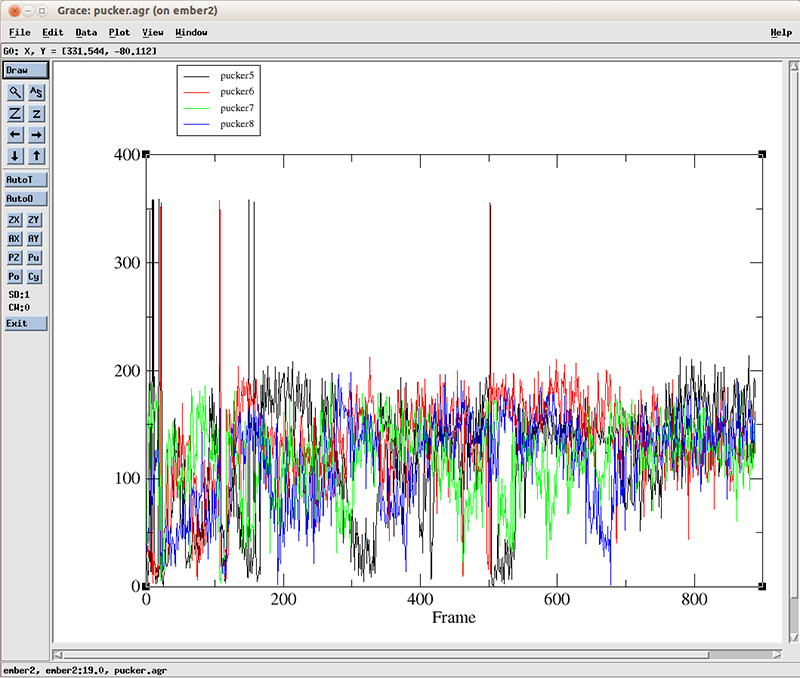 The pucker distribution (file pucker.agr) for residues 5 through 8 looks like this: