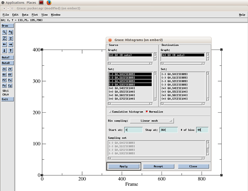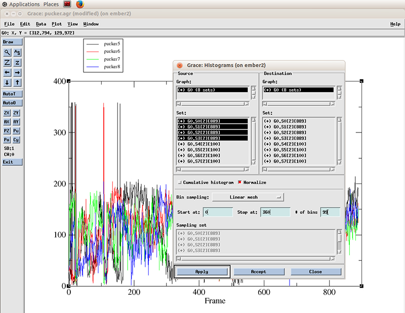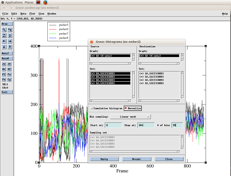 We select all the datasets present (4 because we calculated the pucker distributions for 4 residues). We will calculate a histogram starting at 0 degrees and finish at 360 with 99 bins and normalize it.